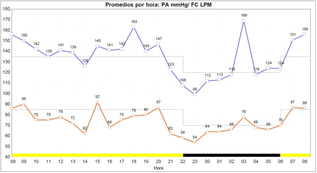 La imagen muestra la presión arterial sistólica (en azul) y diastólica (en naranja) a lo largo de 24 horas. Como puedes ver, la presión cambia durante el día y la noche: no se mantiene fija en ningún momento del estudio.
